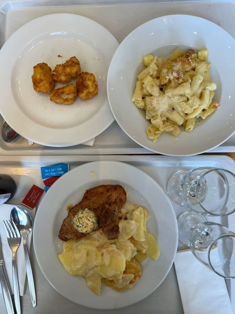 When we reached, it was cold and windy; nevertheless, we walked around the terrace taking in the sweeping views of the Swiss Alps and 29 surrounding peaks and clicking photos! By this time, we were hungry, so we headed straight to the restaurant. A nice spread of hot buffet offering Valais region’s specialities awaited us. We settled for garlic soup with a Valais bread roll and Zermatt cheese, raclette-potato chips and, Lamb shoulder confit with potato gratin and wild broccoli and a dessert – Apple strudel with vanilla sauce. I also spotted the locally brewed whisky aptly named ‘3100’, which I grabbed.