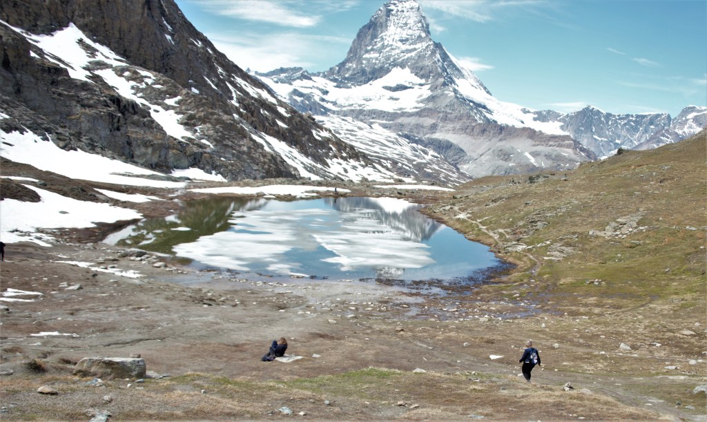 As planned, we got down at the small Rotenboden station, two stations before the last stop, to begin our short hike to Rifflesee lake. This stopover has gained its importance during last few years as you get to see a perfectly inverted mirror-image of the Matterhorn on the unruffled lake’s surface on a clear day. A 15 minutes’ downhill hike on unpaved, rugged terrain took us near the lake’s edge!