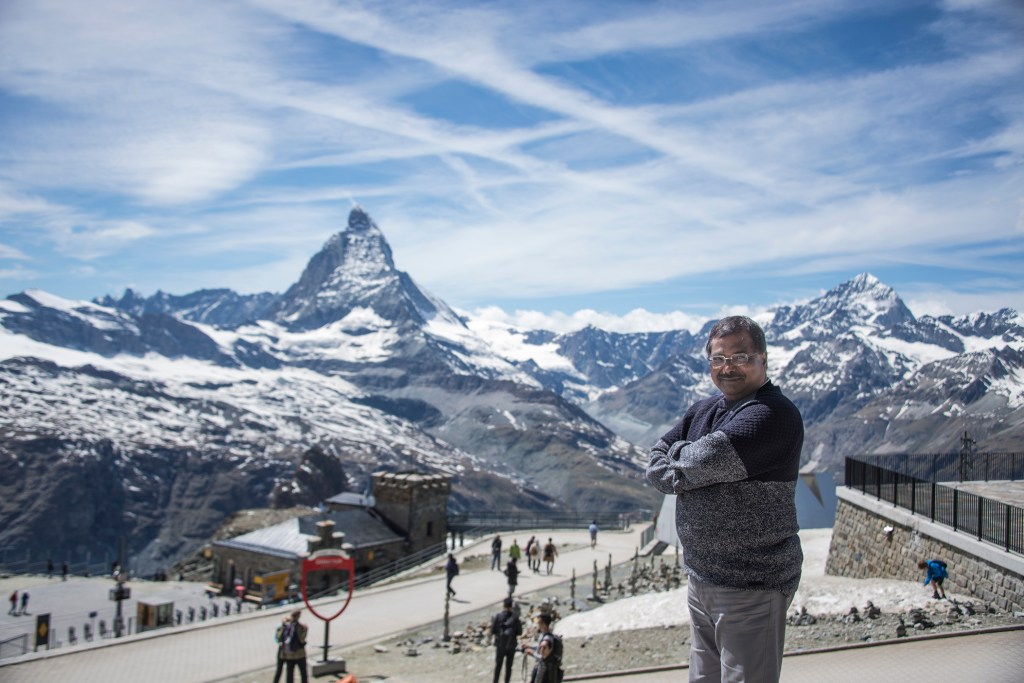 As the red-coloured, four-carriage cog-wheel train started its 45 minutes’ uphill journey chugging through the Alpine woods, meadows, gorges, tarns, bridges, tunnels and the vast, open glacier mountains taking sharp turns. We were in awe every time when we saw the iconic Matterhorn rising majestically above the surrounding glaciers with its impressively monolithic, near-symmetric pyramidal peak.